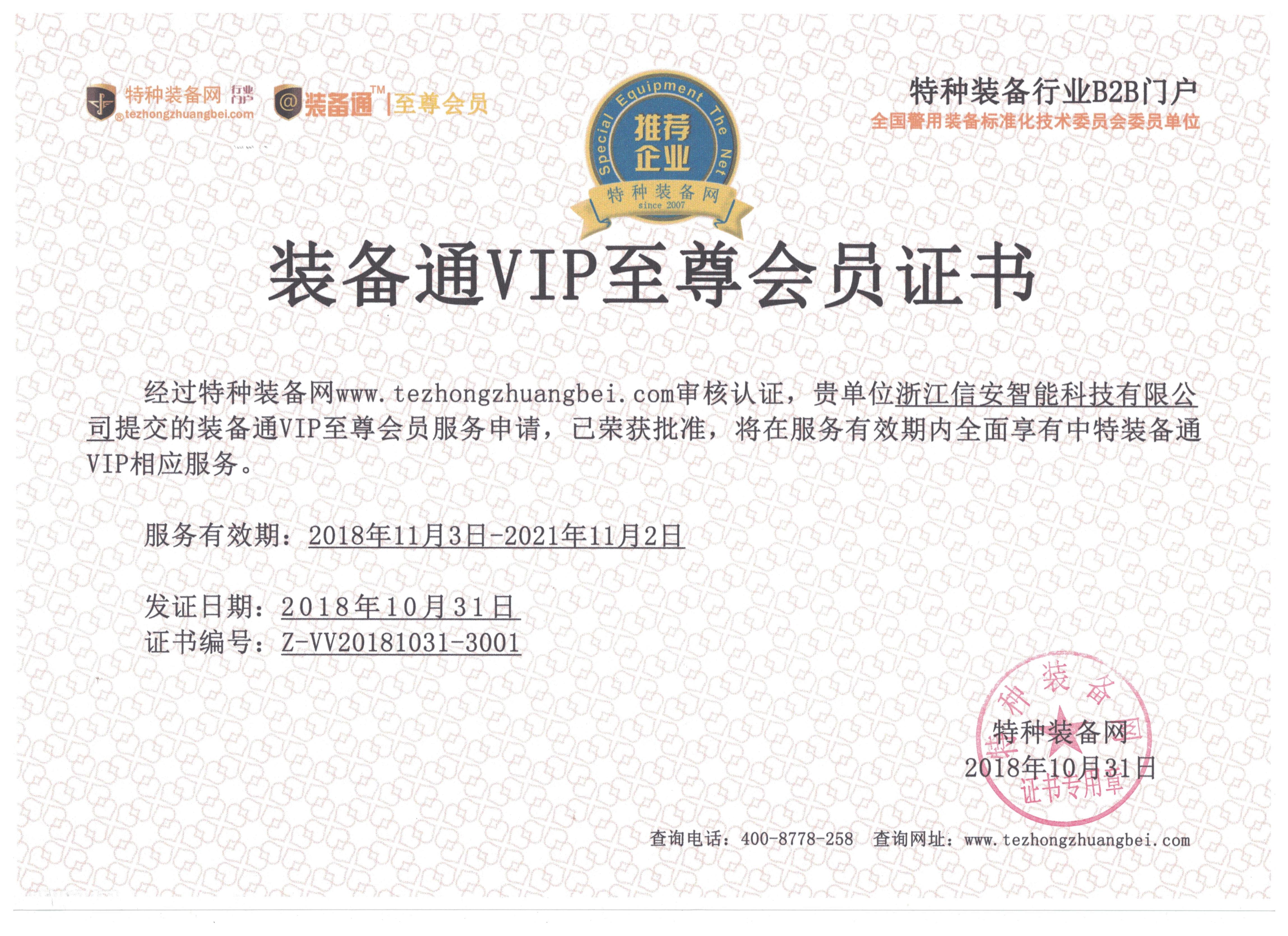 恭喜浙江信安智能科技榮獲特種裝備網(wǎng)“裝備通VIP至尊會(huì)員”證書