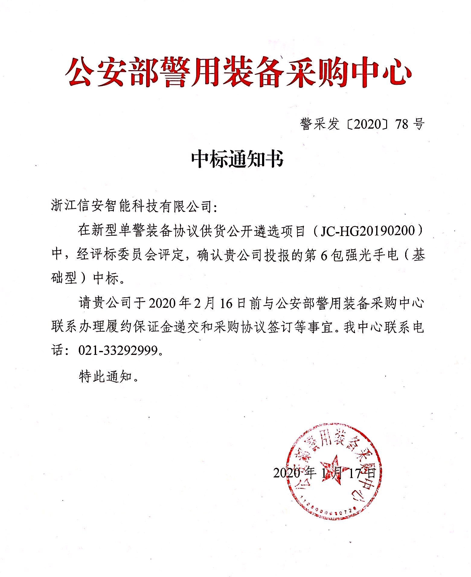 在新型單警裝備協(xié)議供貨公開(kāi)遴選項(xiàng)目(JC-HG20190200)中,經(jīng)評(píng)標(biāo)委員會(huì)評(píng)定,確認(rèn)貴公司投報(bào)的第6包強(qiáng)光手電(基礎(chǔ)型)中標(biāo)。