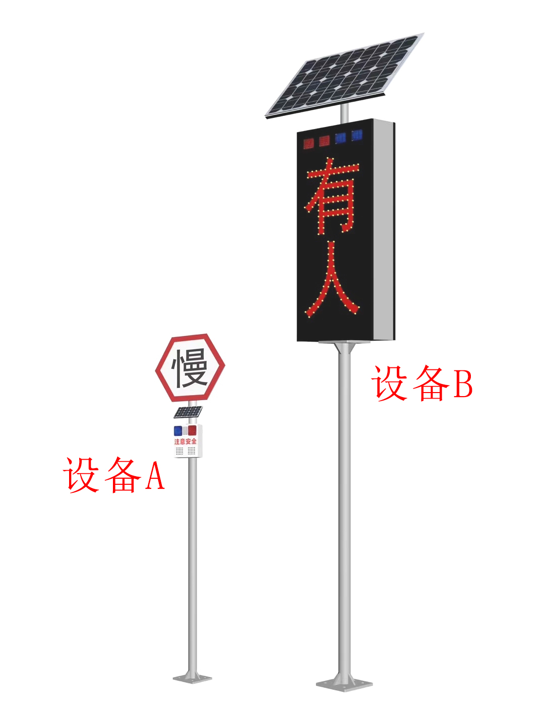 工作原理:當(dāng)安裝在鄉(xiāng)道一側(cè)的設(shè)備A 探測到電動(dòng)車或行人要穿行經(jīng)過交叉路口時(shí),自動(dòng)發(fā)出語音提示(約10秒后停止),提醒騎行者或行人注意觀察路口車況。同時(shí)觸發(fā)安裝在省道/國道一側(cè)的設(shè)備B發(fā)出警報(bào)聲,且設(shè)備上的“有人”字樣開始閃爍(約10秒后停止警報(bào)和閃爍),提醒汽車駕駛員減速慢行,注意前方路口有行人穿行,可有效減少路口交通事故的發(fā)生。