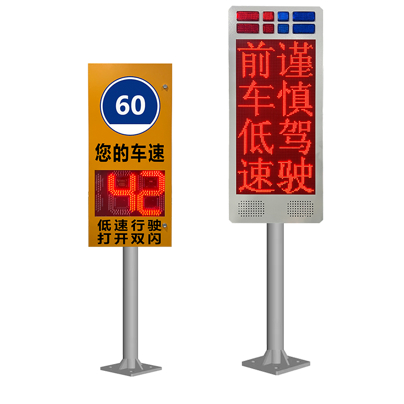 低速預(yù)警系統(tǒng)由雷達(dá)測(cè)速反饋屏和聲光誘導(dǎo)屏兩套設(shè)備組成。當(dāng)測(cè)速屏探測(cè)到車輛低于規(guī)定速度行駛時(shí),聯(lián)動(dòng)信息傳導(dǎo)給后方警示屏,屏幕顯示紅色內(nèi)容,如“前車低速,謹(jǐn)慎駕駛”,提示后方車輛注意前車低速行駛,避免追尾。若來車正常速度行駛,警示屏則顯示綠色內(nèi)容,如“注意車速,謹(jǐn)慎駕駛”。