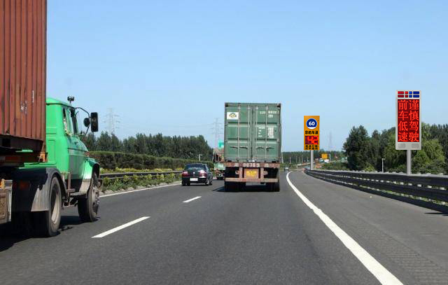 該系統(tǒng)主要安裝在高速爬坡路段、山區(qū)急彎盲區(qū)路段、追尾事故多發(fā)路段。當(dāng)載重貨車低于最低限速行駛時(shí),能有效提示后方車輛,注意控制車速,及時(shí)變道,避免追尾。