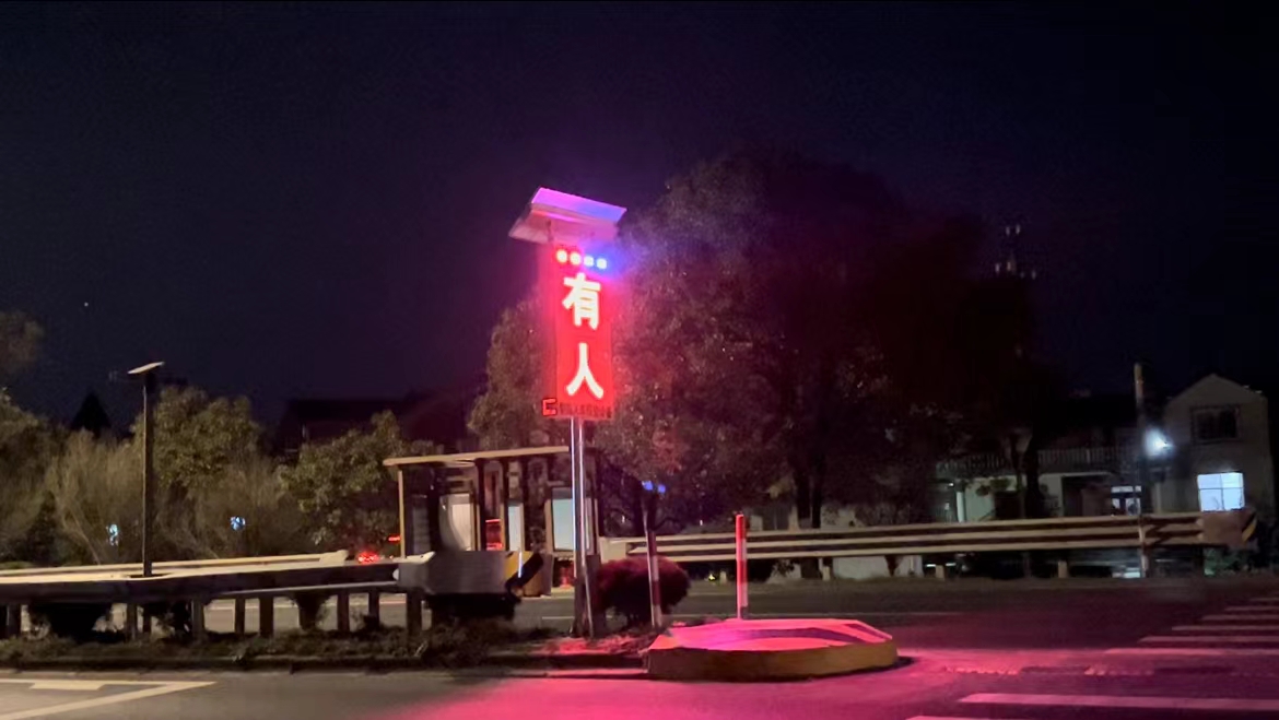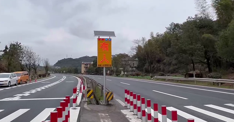該設(shè)備主要安裝在鄉(xiāng)道與國道、省道交叉路口事故易發(fā)路段。當(dāng)設(shè)備上兩側(cè)的雷達(dá)探測(cè)感應(yīng)到行人或電動(dòng)車將要穿行交叉路口時(shí),自動(dòng)觸發(fā)“有人”閃爍,提醒雙向汽車駕駛員前方路口行人穿行,注意安全減速慢行,可有效減少交通事故的發(fā)生。